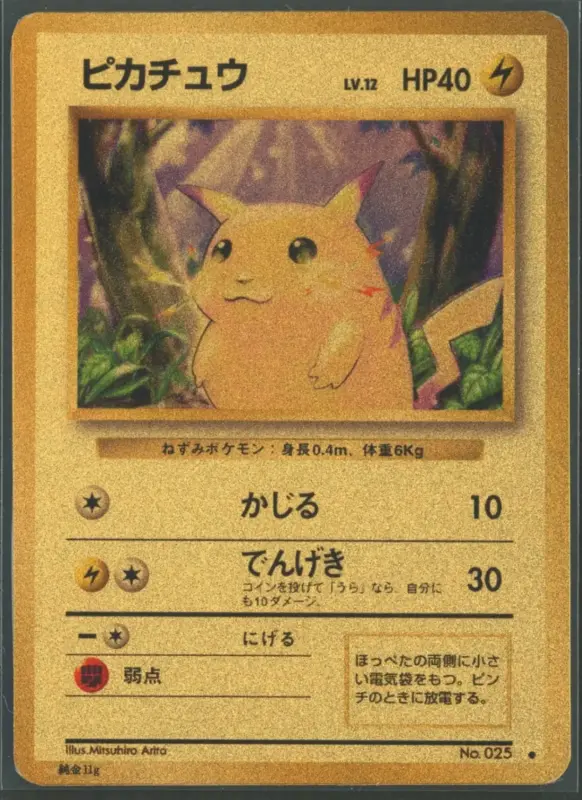 2018年に20周年記念として定価22万円で抽選販売された、文字通り純金(K24)製のカードだ。当初の価格から考えると、とんでもない高騰ぶりだよな。金そのものの価値上昇と、ポケカ市場の活況が相まって、今や市場では650万円、フリマアプリでは900万円での出品例も確認されている。ピカチュウという世界的アイドルと「金」という普遍的資産の組み合わせは、まさに最強だぜ。